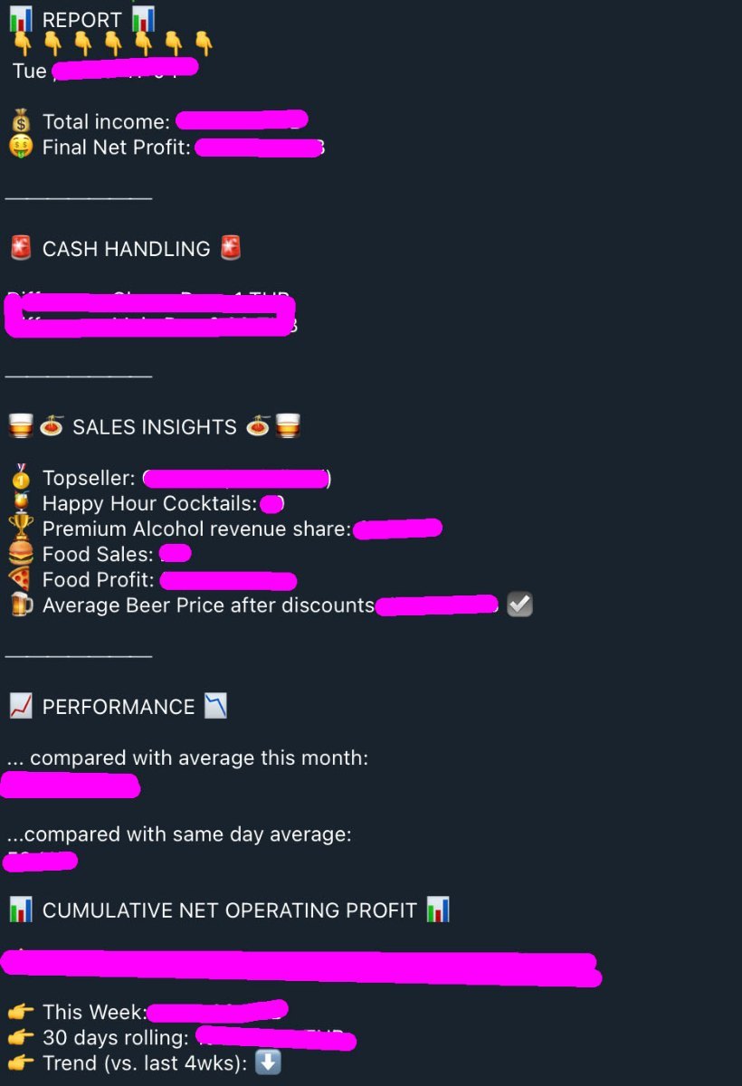 I just realized that the link in my OP is only available to logged in N8N users, sorry about that! ... still learning Here's the public link with some more information: https://n8n.io/workflows/10420-automated-daily-financial-analysis-from-loyverse-pos-with-google-sheets-and-email/ Any feedback is highly welcome! I also understand that for a Loyverse user new to N8N the initial setup required to make this workflow work with your POS can be overwhelming. You think you know your numbers because you check them monthly/weekly? You will be surprised how much you can learn from daily reports boiled down to the metrics actually relevant to your business! ... or maybe you're thinking, 'Does it really matter how many of my vegan food customers drink Gin tonics?' And honestly, you're probably right! But why not just track it anyway? Who knows, maybe one day you'll be lying awake at 3 AM dying to know the answer! The workflow can be easily adjusted to capture all this random data in Google Sheets, which is great because trying to pull and connect those specific data points from the standard Loyverse reports later on is a huge pain. Invest 20-30 minutes in setting up and fine-tuning this free add-on for your POS ... store all data combined in a single spreadsheet. This provides the perfect foundation, both retrospectively and for the future, should you, a government agency, or your partners want to take a closer look at your figures! ..send yourself or your responsible employee a daily report that briefly and concisely summarizes the most important daily data for quick operational decisions (see screenshot of my report below)... or build a report that goes into detail on key performance indicators specific to your business. You need the "integrations" subscription since API access is required but the N8N template is available free. Anyone who needs help with setting this up or customizing it, feel free to get in touch -