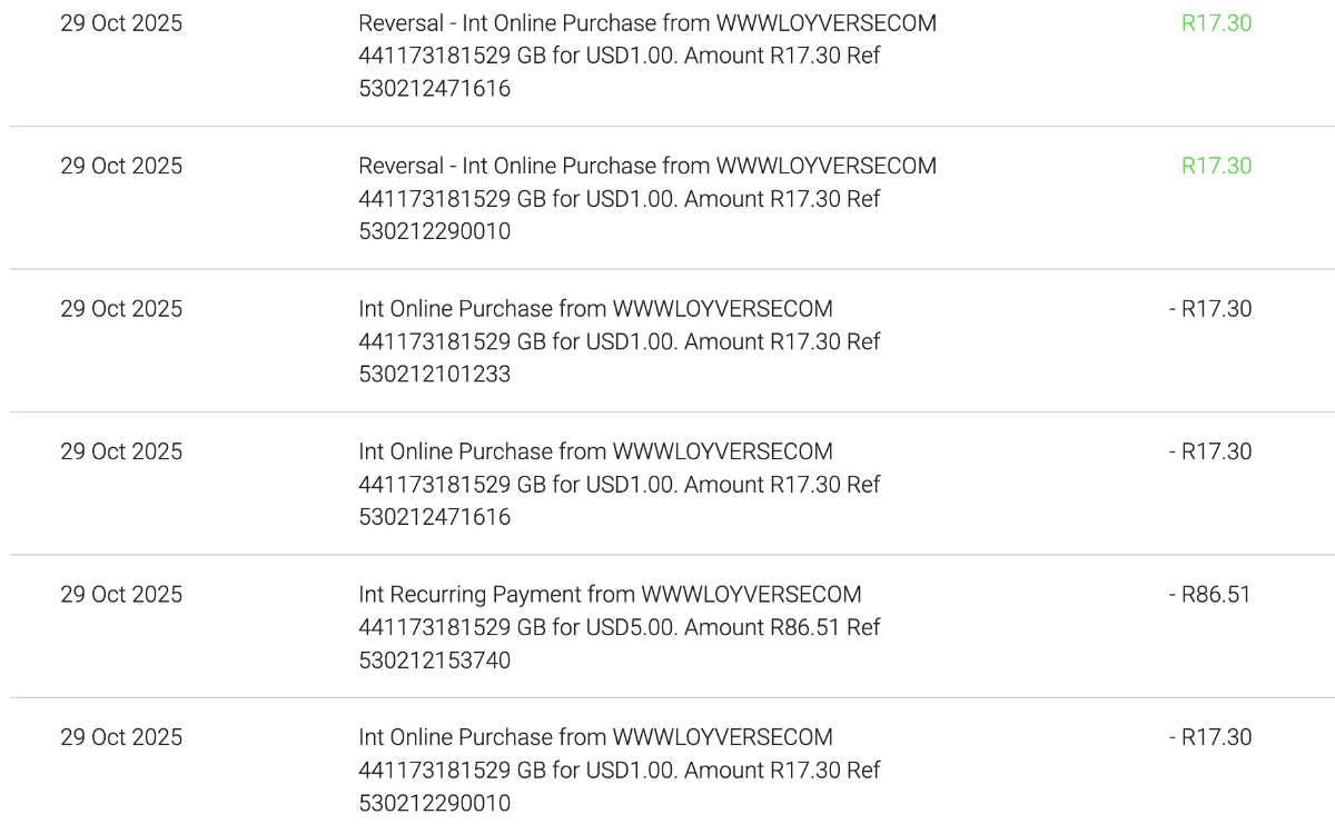 Hello, As I can see, you have been charged one amount of R86.51 it around $5 USD for the Unlimited sales history subscription. The other 5 records for R17.30 equal $1 USD and are the amounts for card verification and refund of the card verification amount to your account. To verify a card, the payment gateway charges $ 1 USD as a test. Then the transaction will be canceled and the 1$ will be returned to your account. Although you may expect a “Refund“ on your bank statement, but it will be no payment or refund. It will appear as if the whole transaction never happened. The record of the transaction will disappear, and the balance of the bank account will be restored as before that 1$ transaction. Sometimes it takes up to 7 days to cancel those test transactions. You may contact us at help@loyverse.com if you need any additional details. -