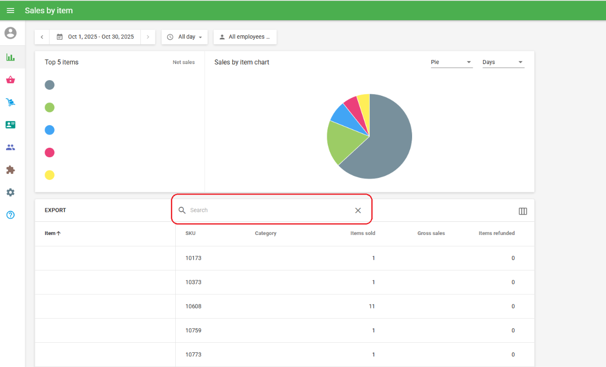 In the Sales Report by Item, can you please add Search Feature (highlighted in red box in the photo) The intention is to easily search each Item or SKU what was sold for specific date range instead of scrolling each Page navigation to see the specific Item or SKU