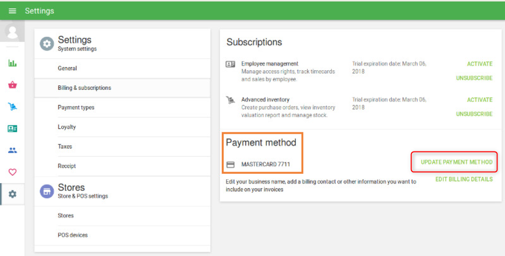 Christine Posted Thursday at 11:12 AM Posted Thursday at 11:12 AM Hello, to update payment method in Loyverse, please got to Back office --> Billing & subscriptions page and press Update Payment Method button https://r.loyverse.com/dashboard/#/settings/account Here you can find more details about process https://support.loyverse.com/en/articles/1613175-how-to-add-a-payment-method-in-the-billing-subscription-section You also can recive immediate support via Online chat, or write to help@loyverse.com for additional help.