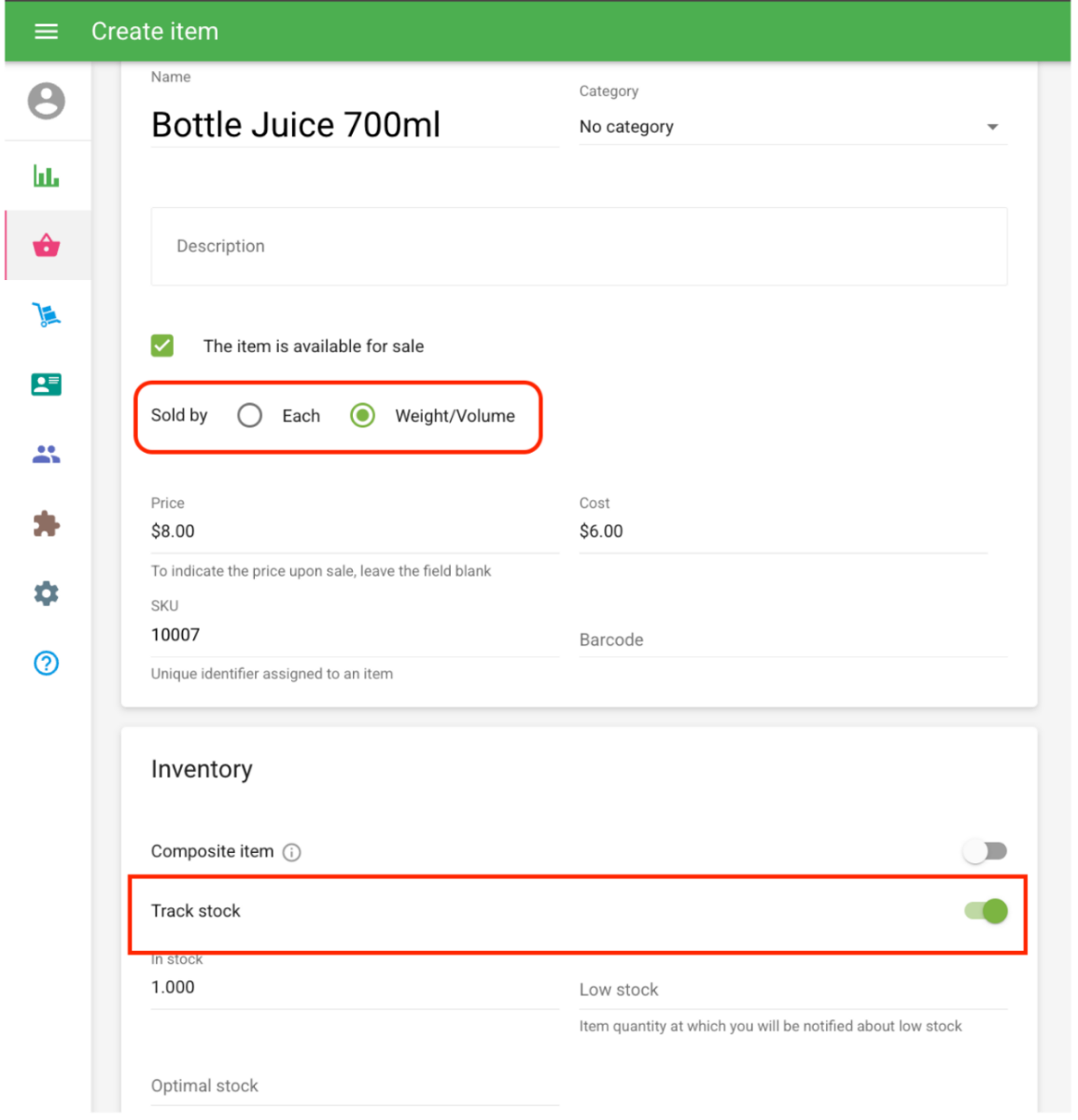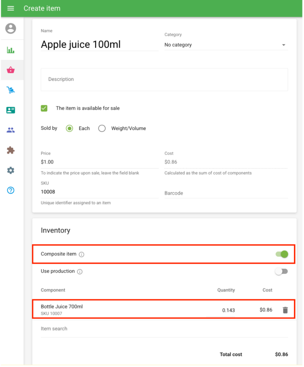 Hanna Posted 9 hours ago Posted 9 hours ago I’d recommend using the Composite feature for this. You can start by creating the '700ml Bottle of Juice' as an item, just enter the name, price, and cost, and make sure to enable Track Stock. From there, you can enter the total number of bottles currently in stock in the quantity field. For example, if you have three bottles, enter '3' to represent three individual bottles. After saving, you can create the 2nd item to be able to manage selling the 100ml item. For the 2nd item, activate the composite feature and add 700ml bottle as its component. In the quantity field, enter 0.143. Why 0.143?: Since 100ml ÷ 700ml = 0.143 x 7 shots =1 / 1 bottle So every time you sell 1 glass of juice, 0.143 will be deducted from the bottle stock. This means that if you sell 7 glasses of juice, it will be equivalent to 1 bottle.