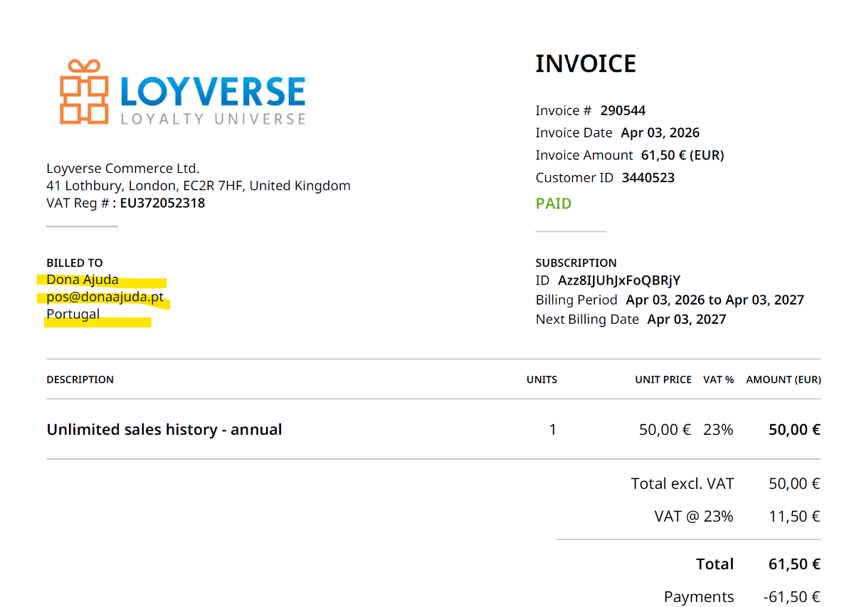 donaajuda Posted 4 hours ago Posted 4 hours ago Hi! We have received the invoice from Loyverse regarding the subscribed service; however, we noticed that the invoice does not include our VAT number (tax identification number), which in Portugal makes the document fiscally invalid. How and where can we register our association’s details so that future invoices are issued with our VAT number? Thank you very much.